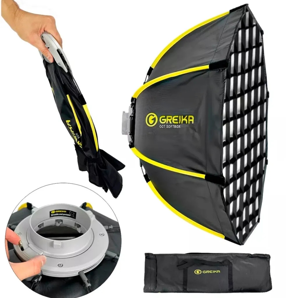 O Softbox Octa Dobrável Greika Bowens é uma solução de iluminação projetada para oferecer controle preciso, suavidade e portabilidade em produções fotográficas e audiovisuais. Com estrutura dobrável e montagem ágil, é ideal para estúdios e trabalhos em locação.